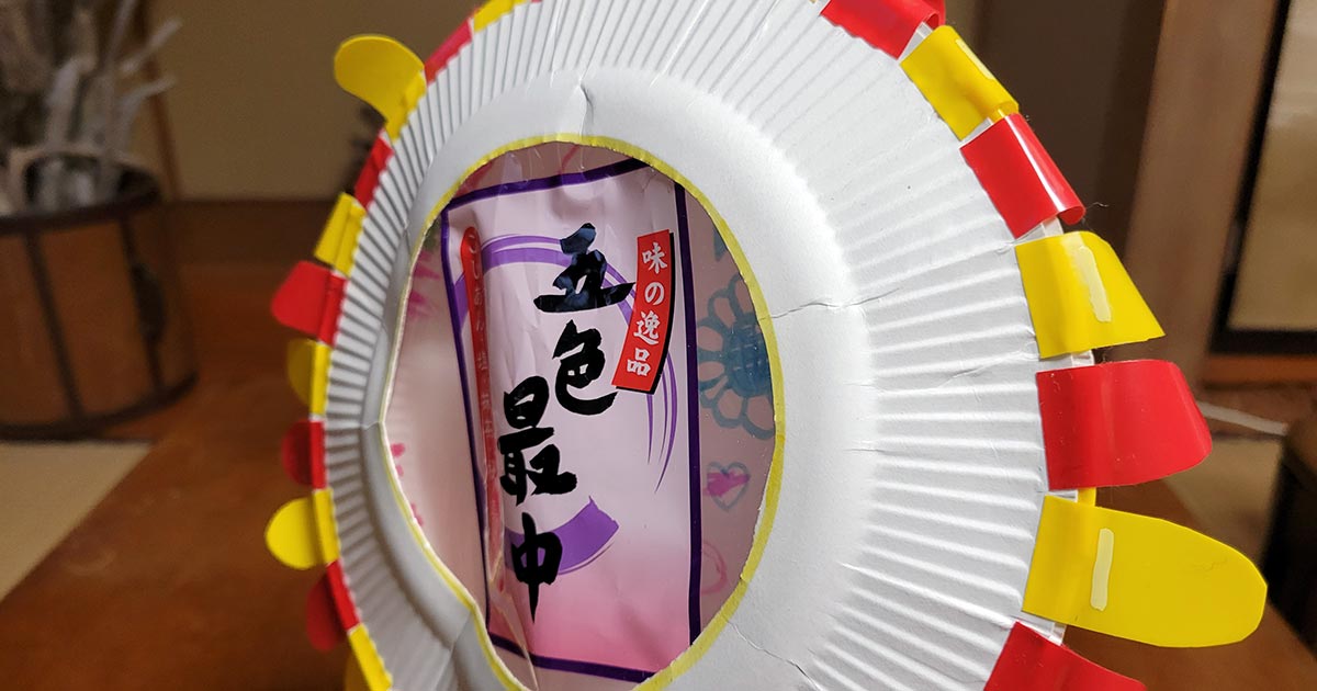 木工ボンドが乾いたら紙皿の周りに赤と黄のビニールテープを貼っていきます。